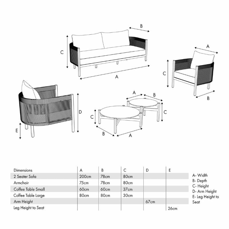 Complete Lounge Collection: Comes with a 2-seater sofa, two armchairs, plus large and small coffee tables — ideal for creating a balanced outdoor living space.